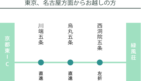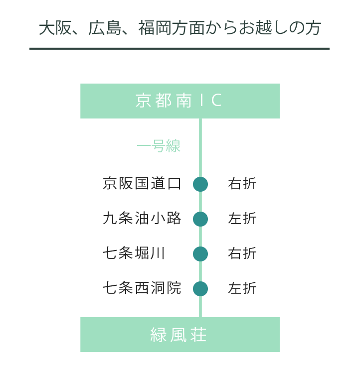 京都駅バスターミナルより市バス50系統にご乗車下さい。(片道230円)京都駅より3つ目の「西洞院六条」で下車。バス停向かい側に緑風荘がございます。