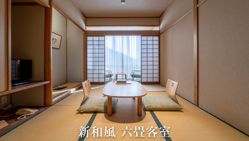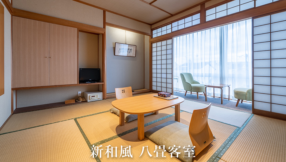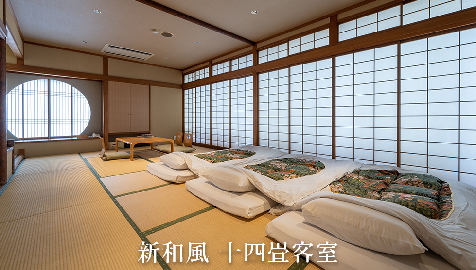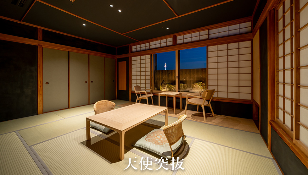 当旅館の客室は、2022年から2023年2月にかけて順次リニューアルを実施した、コンセプトルーム「天使突抜」と新和風6・8・10・14畳に加えて、飾らぬ温もりを感じる旧来の和室14畳部屋の6タイプからお選びいただけます。